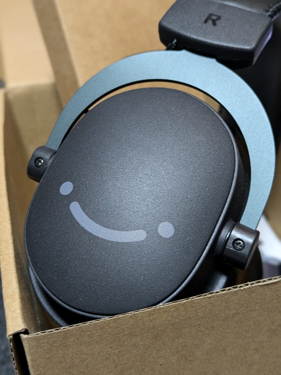 ニコニコデザインが可愛いですが、個人的には好みではないですね。ヘッドバンド上部にあるようなメーカー名の印字で良かったんじゃないかなぁと思います。